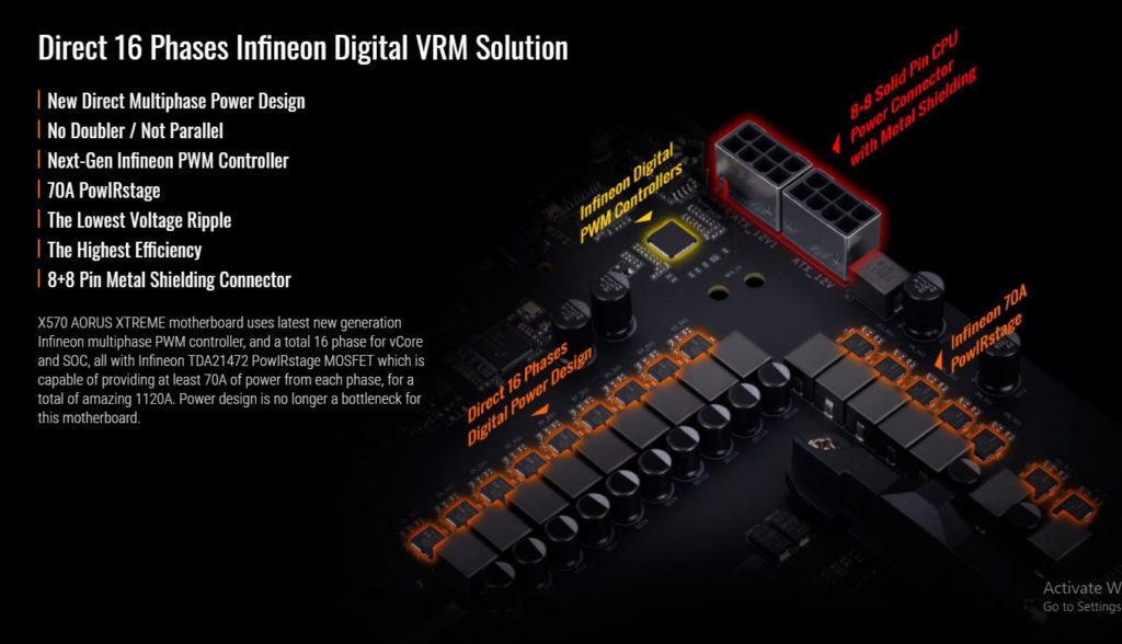Por otra parte, utiliza un nuevo sistema de alimentación Infineon de 16 fases VRM que consta de un nuevo Sistema Directo Multi-Fase, nuevo controlador PWM de Infineon, MOSFET TDA21472 PowIRstage capaces de entregar 70A por fase, etc Este es el motivo de que la motherboard requiere de doble conector de alimentación de 8+8 fases.