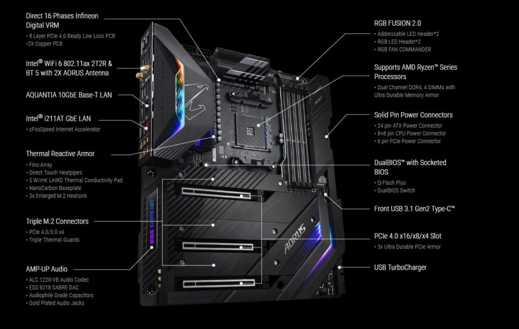 Indagando un poco más en sus especificaciones, la motherboard X570 AORUS XTREME viene con el socket AM4 que a su vez es compatible con todos los modelos de procesadores AMD RyZEN de 2da generación y de 3era Generación (con gráficos Radeon Vega). También incluye cuatro slots DIMM que soportan hasta 128GB de memoria DDR4 de doble canal con frecuencia desde 2133 MHz y hasta 3200 MHz.