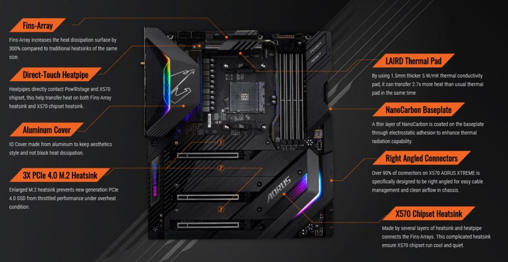 Otra característica importante de la motherboard X570 AORUS XTREME es su nueva armadura con innovador diseño térmico que se encarga de controlar las temperaturas del CPU, Chipset y SSDs cuando estén en carga. Para conseguirlo se ha utilizado una base de NanoCarbon en la parte trasera del PCB, un disipador de aletas de cubierto de una placa de aluminio que va conectado a un heatpipe, se han usado thermal Pad LAIRD 5W/mK, y tres enormes disipadores para los SSDs M.2.