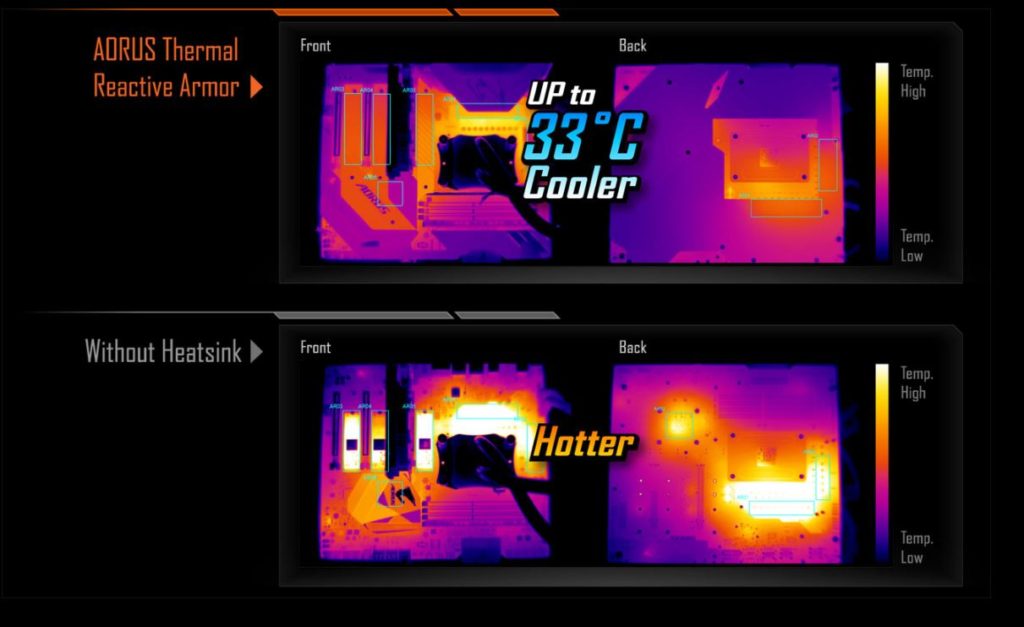 De acuerdo a GIGABYTE, esta solución garantiza que la motherboard será hasta 33° más fría que si no se usará la armadura. Esto último vale la pena resaltar ya que todo esto se logra mediante disipación pasiva, mientras que en otras generaciones hubiera sido necesario enfriamiento líquido.