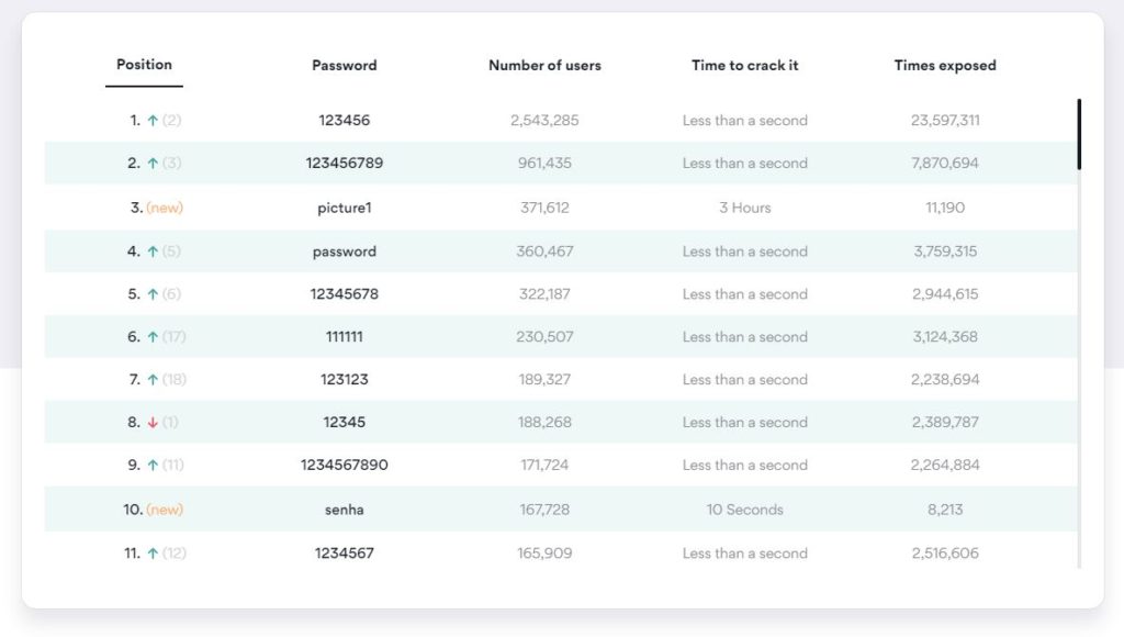 En este estudio se reveló que siete de las diez peors contraseñas están compuestas de por varias combinaciones secuenciales de números, como es “123456”, “123456789” y “12345678” ocupando el primer, segundo y quinto lugar, respectivamente; mientras que el tercer lugar fue “picture1”,seguido por la ya frecuente en esta lista: “contraseña”.