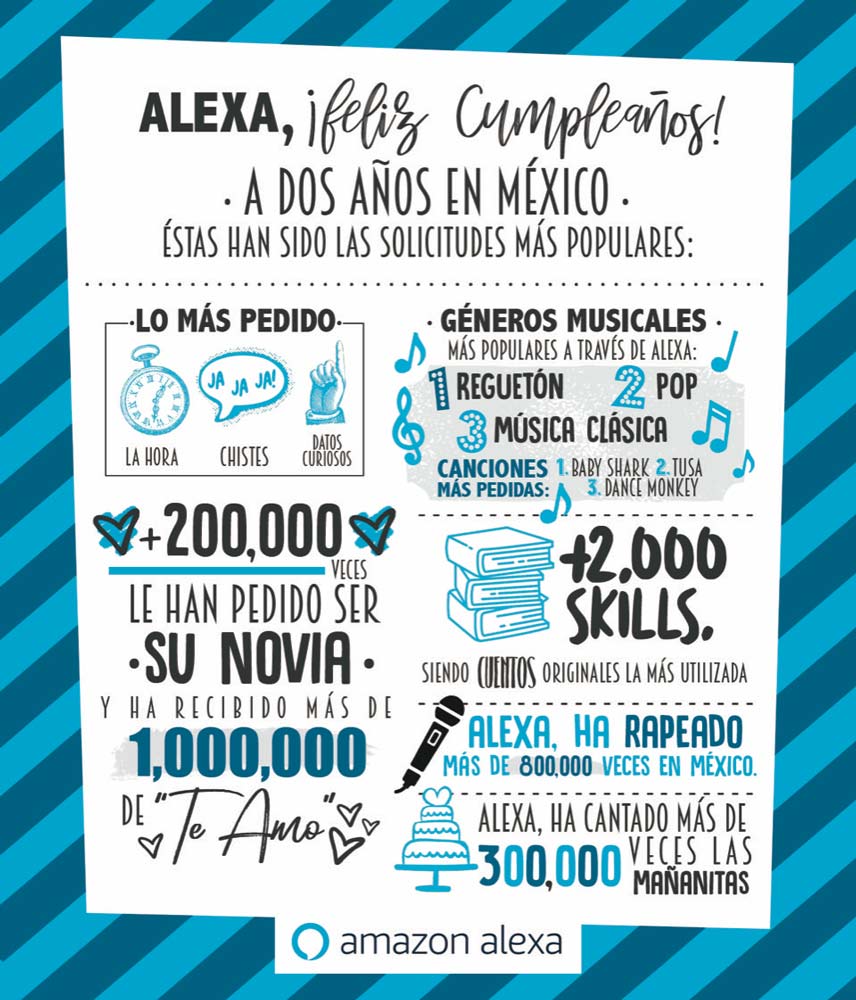 Aprovechando que Alexa está celebrando su segundo cumpleaños en México, seguramente, muchos se han preguntando ¿qué es lo que más le han preguntado a Alexa? De acuerdo a una infografía que nos compartío Amazon aquí tenemos la respuesta.