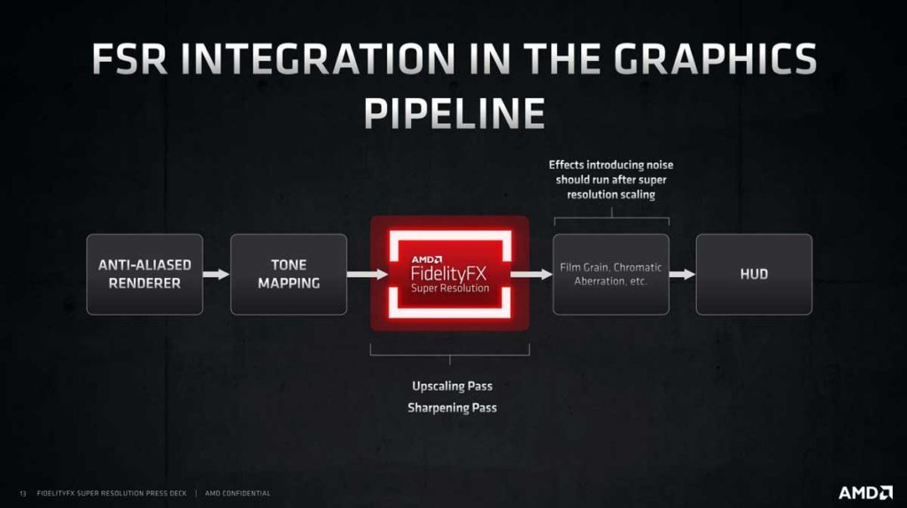 Una ventaja adicional de que la Tecnología AMD FSR se ejecute en una sola etapa dentro del pipeline gráfico, es que la hace una técnica de escalado muy simple y sencilla para que los desarrolladores de videojuegos la puedan agregar a sus videojuegos de forma muy fácil.