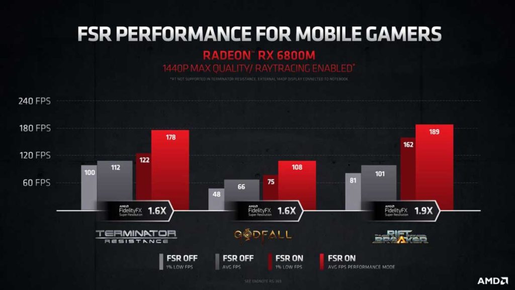 Asímismo detalló que AMD FSR brinda importantes mejoras de rendimiento de hasta 1.9x en laptops basadas en la Radeon RX 6800M y hasta de 1.8x veces mayor rendimiento con la Radeon RX 580 en Calidad Máxima a 1080p.