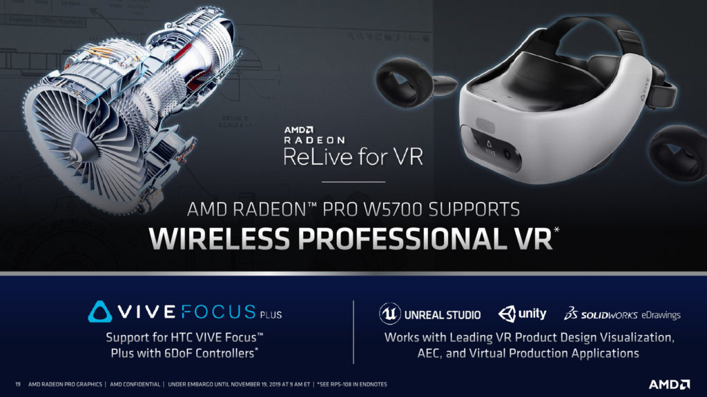 También es la primera tarjeta profesional de AMD que incluye un conector USB Type-C con lo pueden conectarse múltiples monitores. De esta forma se tiene soporte para la Tecnología AMD Radeon ReLive para que profesionales desarrollen aplicaciones basadas en VR con cascos como el HTC Vive Focus Plus.