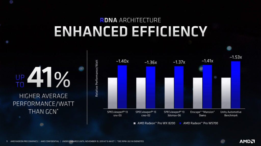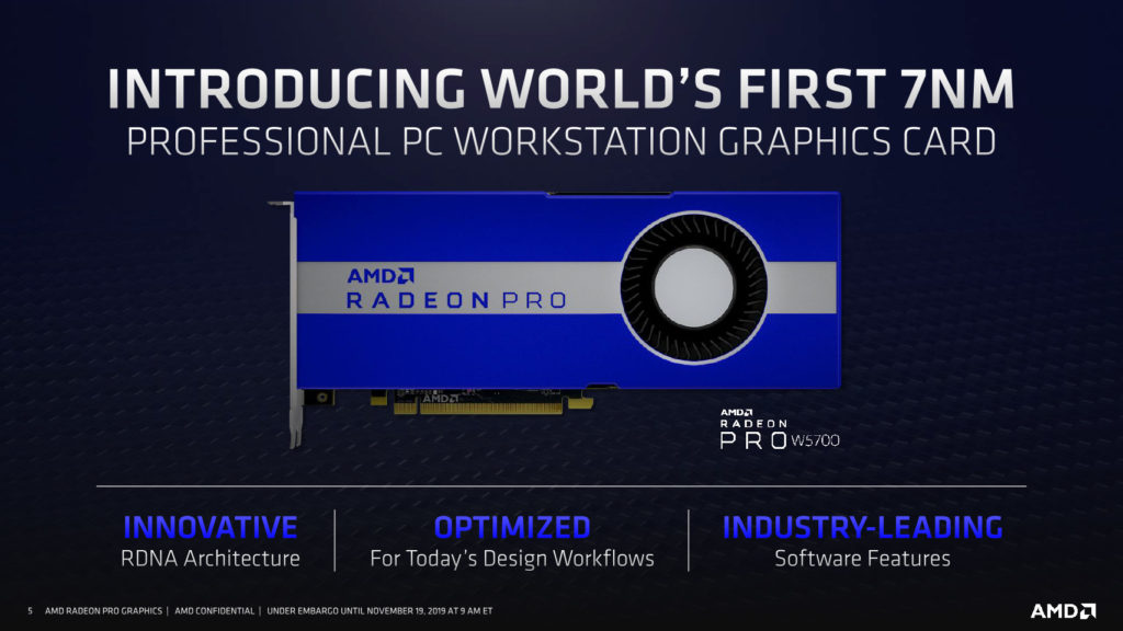 Para esta última parte del 2019, la compañía está anunciando su primera tarjeta profesional para Workstation con arquitectura de 7nm: la AMD Radeon Pro W5700, diseñada para artistas 3D, arquitectos, ingenieros; la cual promete hasta 41% mayor efiencia en consumo de energía y hasta 5.6x veces mayor rendimiento que una Quadro RTX 4000.