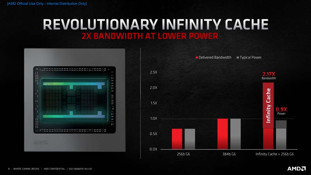 Esta importante mejora se atribuye al uso de un nuevo diseño Infinity Cache design, optimizaciones adicionales y un incremento importante en frecuencias que superan los 2GHz.