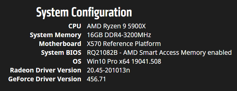 En este caso se uso un procesador AMD RyZEN 9 5900X “Zen 3”. También se habilitó la Tecnología Smart Access Memory en el BIOS que ayuda a reducir la latencia de la memoria VRAM. Por otra parte, el modo de overclocking de un clic “RAGE MODE” no se habilitó.