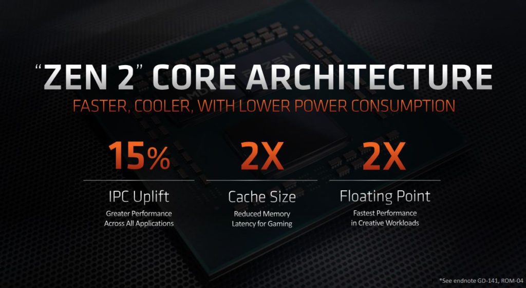 A nivel arquitectura los cambios más significativos tiene que ver con un rediseño en la ejecución del pipeline, un nuevo controlador I/O de 14nm que incluye soporte para memoria DDR4 de doble canal y PCIe 4.0. También se ha mejorado el procesamiento de operaciones de punto flotante (FPU) incluyendo registros de 256-bits, se ha duplicado el cache y el doble de ancho de banda para unidades de carga/almacenamiento. De esta manera se habla que han conseguido ganar hasta 15% en mejora de rendimiento IPC (Instrucciones Por ciclo) comparado a la primera generación de Zen.