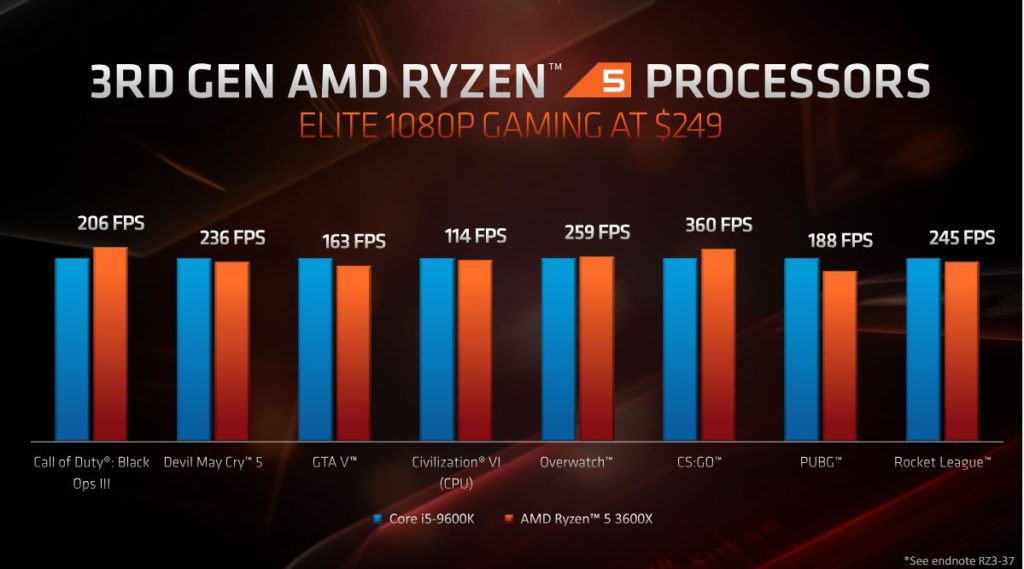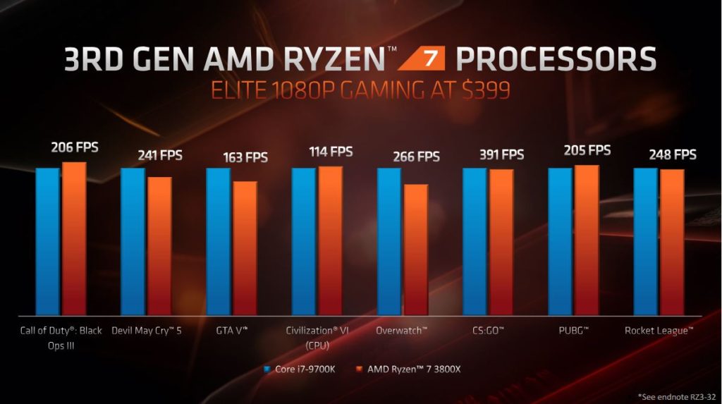 AMD también canta victoria con los procesadores RyZEN 7 de 3ra Generación al señalar que el RyZEN 7 3800X es la mejor opción en el rango de precios de $399 dólares, entregando mayor rendimiento en videojuegos a 1080p que el Core i7-9700K-