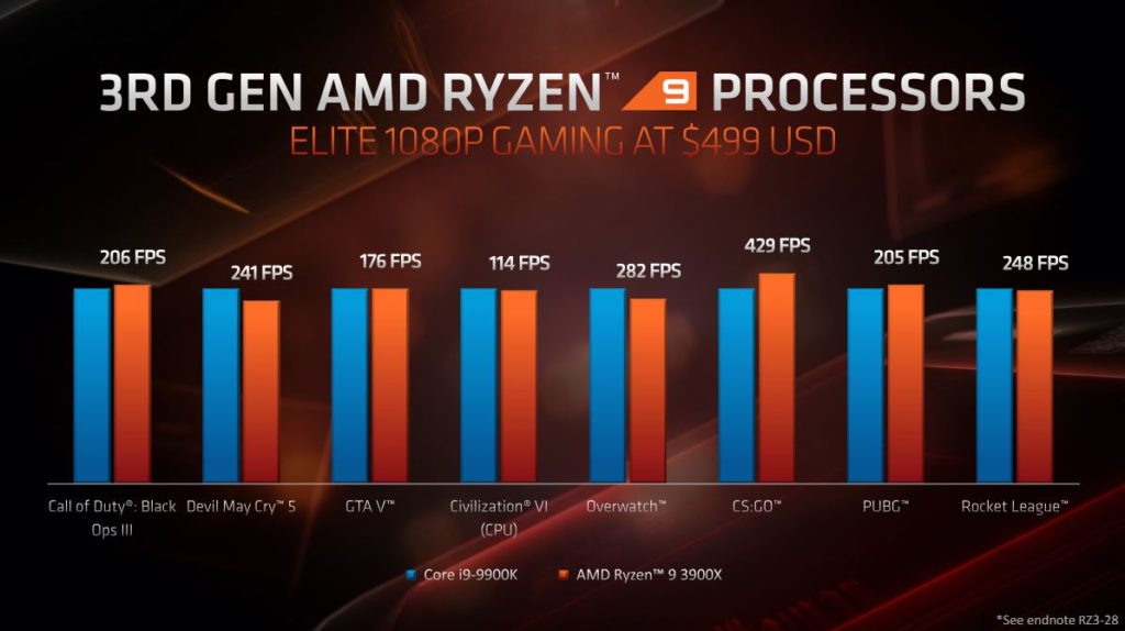 Hablando de rendimiento en videojuegos, los benchmarks preliminares a resolución 1080p señalan que el RyZEN 9 3900X de 12 núcleos es capaz de igualar el rendimiento de un Core i9-9900X. Aquí es importante notar que el procesador Intel quedará en desventaja porque solamente tiene 10 núcleos, aunque para AMD puede que tenga mucho sentido hacer esta comparación ya que hablamos de un procesador que oscila en el rango de los $499 dólares.
