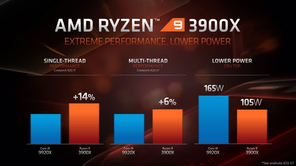 En el caso del AMD RYZEN 9 3900X aseguran que el procesador es capaz de ofrecer hasta 14% mayor rendimiento en aplicaciones de un solo hilo y hasta 6% en aplicaciones multi-hilo que un Core i9-9920X. Pero no solo eso. También destacan que es mucho más eficiente en consumo de energía con un TDP de 105W.