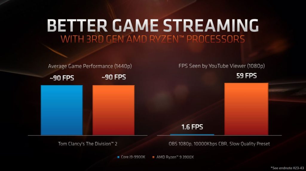 Los procesadores AMD RYZEN 9 3900X están enfocados para Gaming, pero para AMD es obvio que también quieren atraer la mirada de creadores de contenido que hacen Juegan y hacen Streaming al mismo tiempo. En este sentido hacen hincapié que más núcleos tienen mucho sentido.