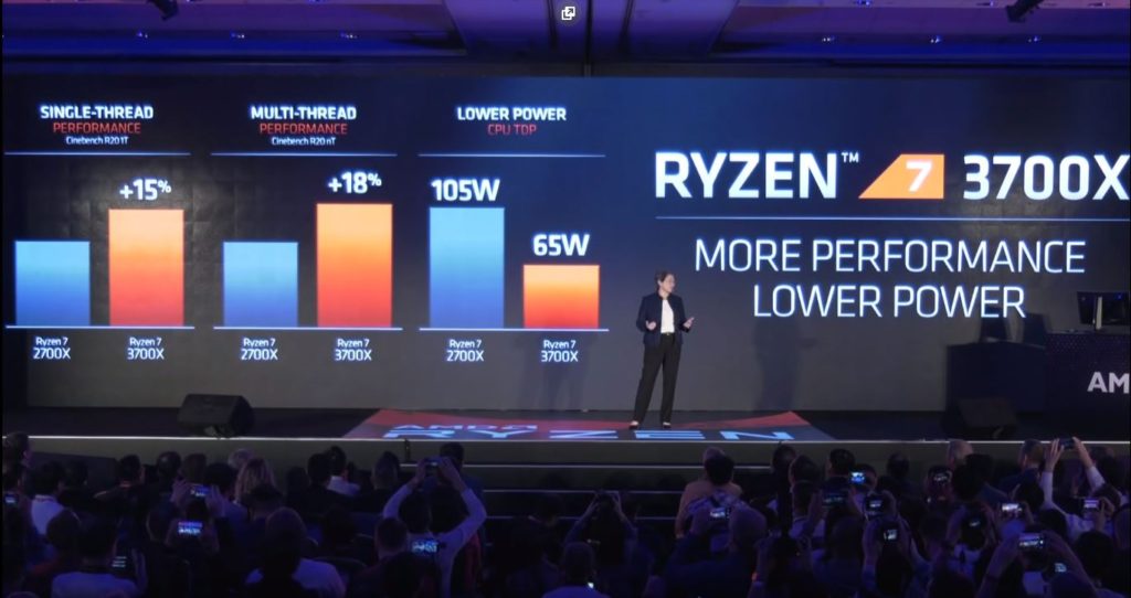 Lo llamativo del asunto es que, según la demostración que mostró AMD durante su conferencia en Computex 2019, el RyZEN 7 3700X con un TDP menor sería capaz de superar al Intel Core i7-9700K de 8 núcleos y TDP de 95W. Esto posiblemente lo convierta en el favorito de gamers por su gran relación precio-rendimiento.