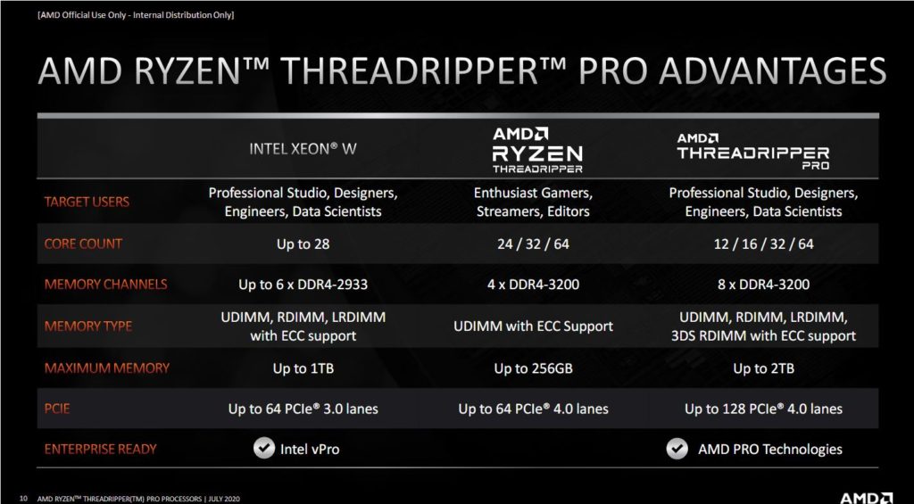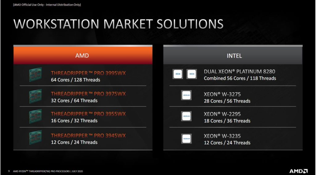 En posicionamiento de mercado, los nuevos AMD Threadripper PRO vienen a competir contra los procesadores Intel Xeon W3275 “Cascade Lake” que están fabricados a 14nm, ofrecen hasta 28 núcleos y 56 hilos y tienen un TDP de 205W.