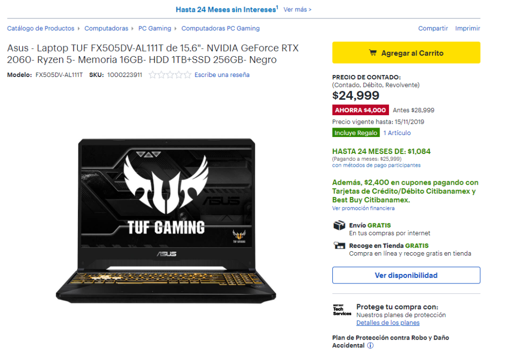 La ASUS TUF FX505DV podemos encontrarla a la venta en BestBuy a un precio de $24,999 MXN pesos mexicanos por el Buen Fin 2019.