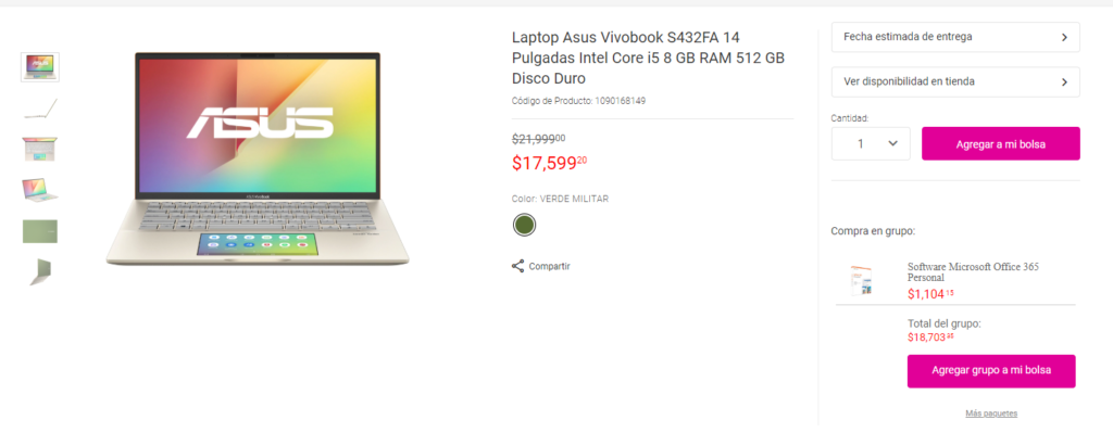 La ASUS VivoBook S432FA está a la venta en Liverpool a un precio de $17,599 MXN pesos mexicanos por el Buen Bin 2019