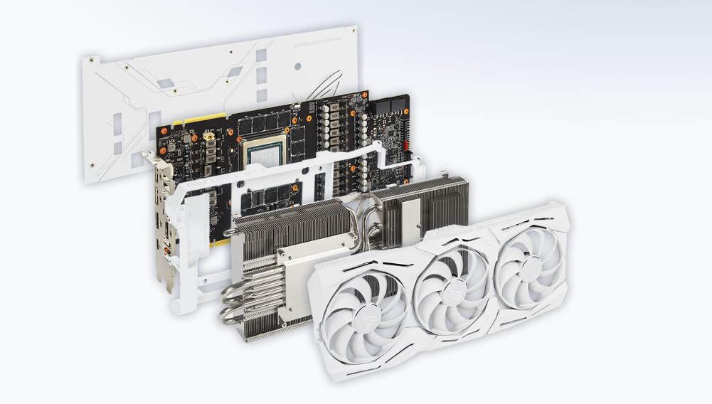 La ASUS ROG Strix RTX 2080 Ti White Edition está construida con lo último en componentes de tarjetas de video ROG de gama alta. En este caso un disipador bastante ancho que requiere 2.7 slots en la motherboard y que utiliza tres ventiladores con Tecnología Axial que entregan mayor flujo de aire y son mas silenciosos.
