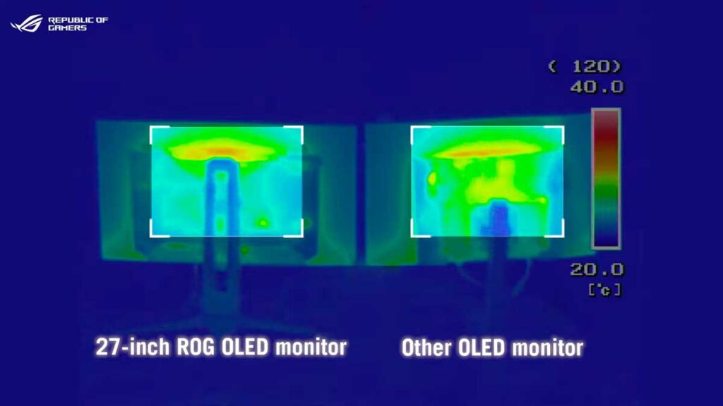 Otra característica muy importante es su nuevo sistema de enfriamiento que mejora considerablemente las temperaturas. Para esto se ha utilizado un nuevo disipador y un nuevo diseño interno que se compone de nuevos orificios más grandes. De esta forma se reduce hasta 5°C las temperaturas comparado a otros monitores OLED de 27″.