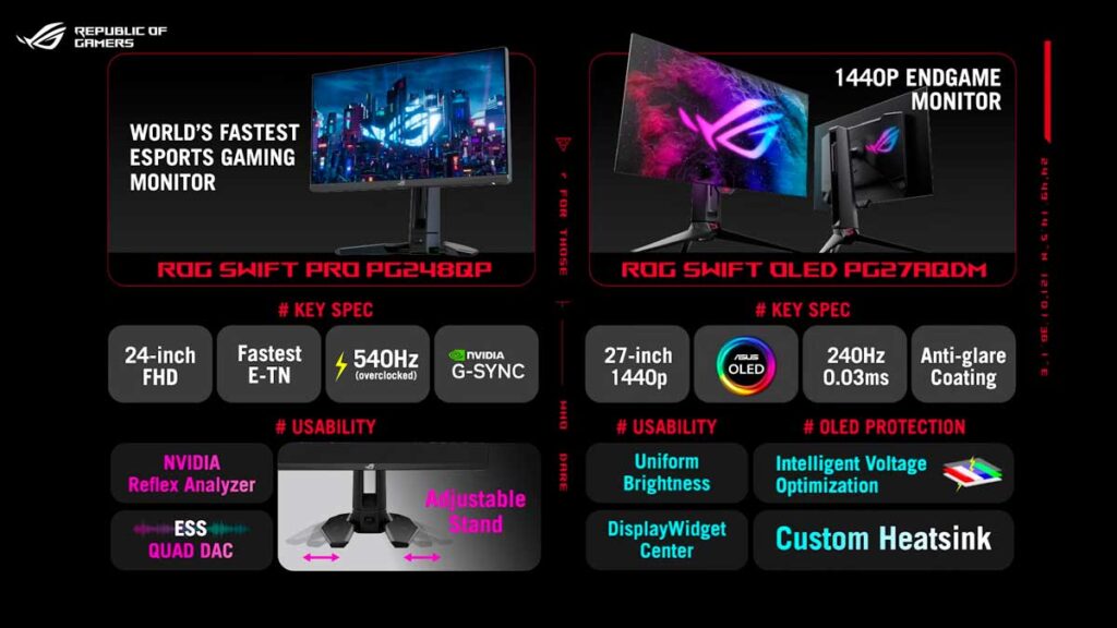 ASUS ha sido uno de los fabricantes más ambiciosos en el segmento de los esports y en CES 2023 lo volvieron a demostrar anunciando el primer monitor gamer con tasa de refresco de 540 Hz: ASUS ROG Swift Pro PG248QP. De igual manera anunciaron un nuevo monitor gamer 1440p con panel OLED.