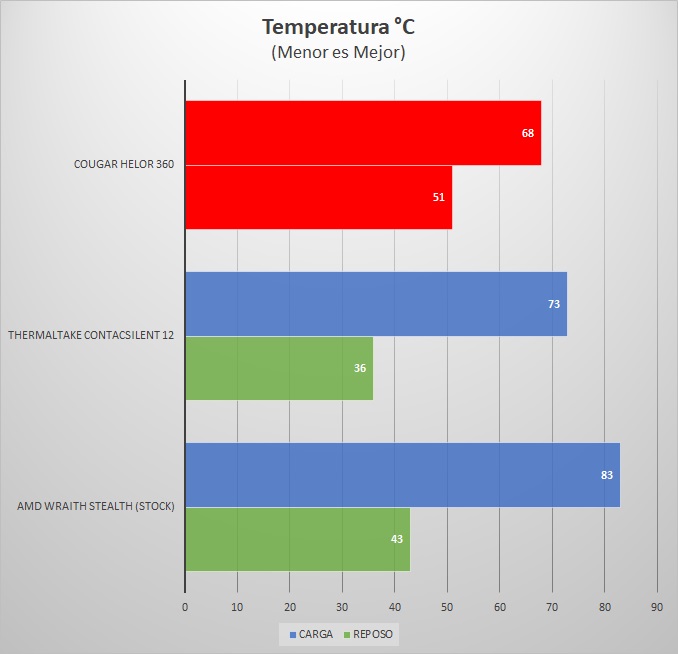 En nuestras pruebas de rendimiento de este review encontramos que el COUGAR HELOR 360 reportó una temperatura de 51°C en reposo lo cual resulto ligeramente más alta comparado al disipador de AMD de fábrica y el disipador Thermaltake ContacSilent 12.