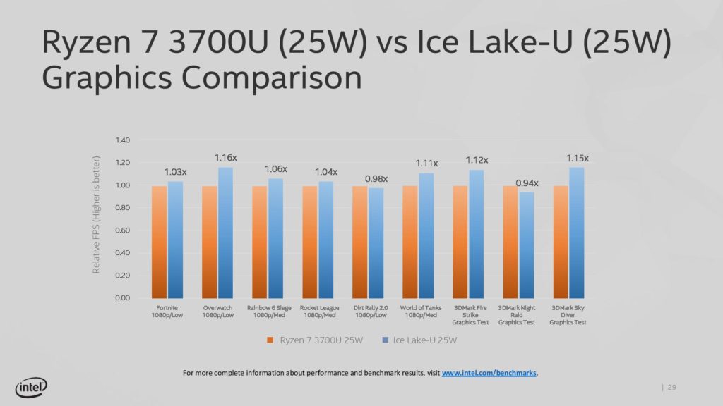 Intel también recalcó que los gráficos integrados Iris Plus “Gen11” serán hasta dos veces más rápidos que los gráficos integrados Vega 10 que traen los procesadores AMD RyZEN 7 3700U. En cuestión de videojuegos indicaron que ofrecerán hasta dos veces mayor rendimiento para disfrutar videojuegos en FullHD en el rango de los 60FPS. Esto será ver para creer.