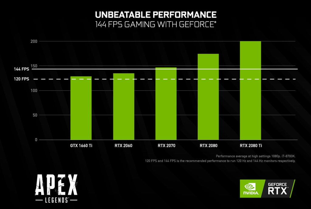 En caso de juegos como APEX LEGENDS, que ha sumado más de 50 millones jugadores durante su primer mes de lanzamiento, NVIDIA recomienda que la mejor tarjeta para garantizar 144FPS es la GeForce RTX 2070 o bien la GeForce RTX 2080 Ti con la que es posible tener más de 200 FPS.
