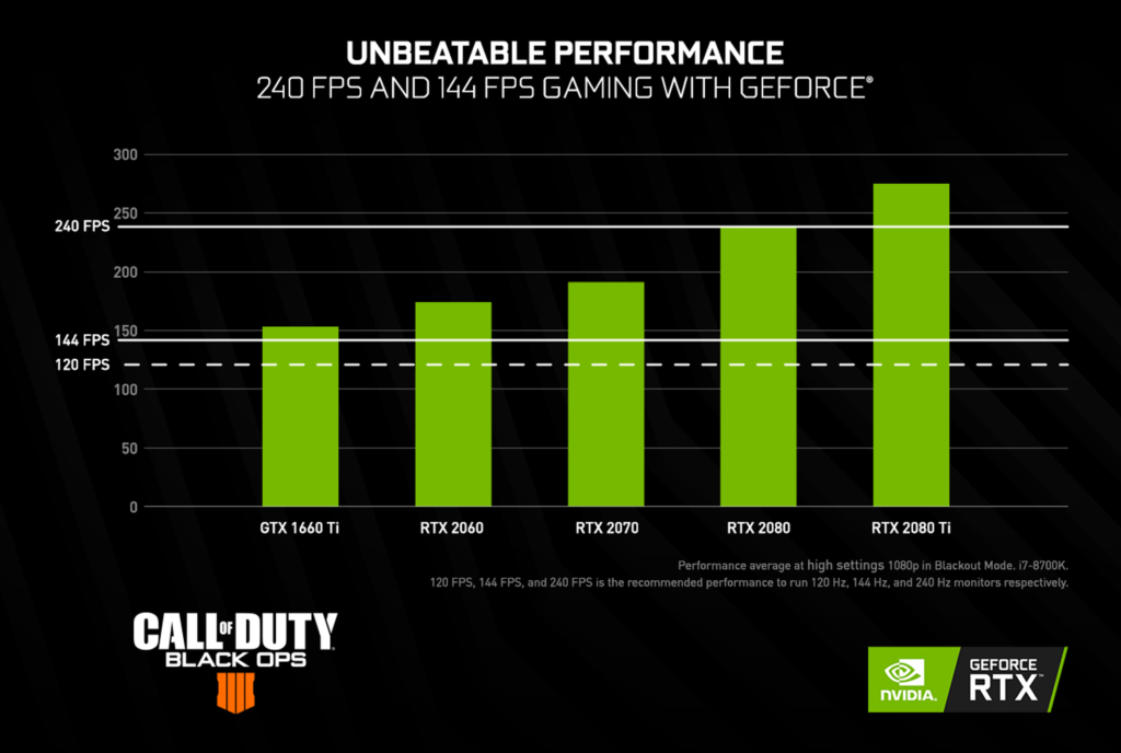 Activision no se podía quedar fuera de la fiebre de los videojuegos Battle Royale. Su respuesta fue el nuevo Call of Duty: Black Ops 4 que incorpora su nuevo modo Blackout. En este caso, NVIDIA sugiere que la GeForce GTX 1660 Ti es suficiente para tener 144FPS con todo al máximo, o bien, una GeForce RTX 2060 si lo nuestro es tener 144FPS estables todo el tiempo en monitores FullHD.