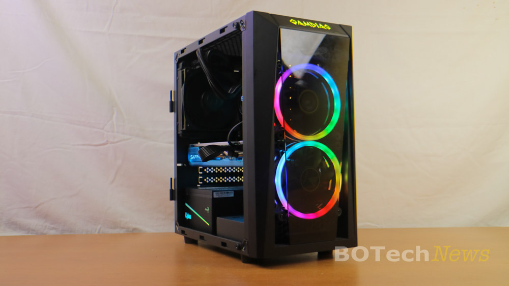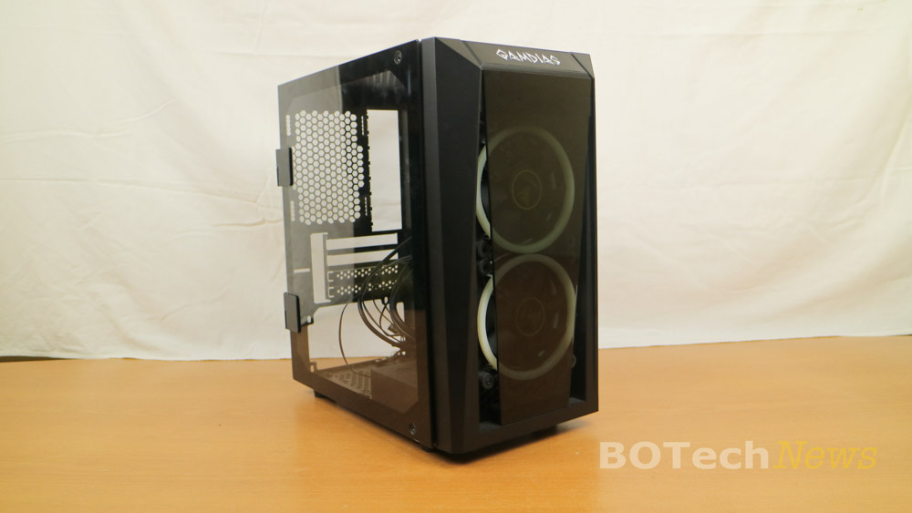 Al igual que en otros modelos, el panel frontal viene con un cristal templado que tiene un corte trapezoidal el cual le brida un apariencia única y sofisticada. Aquí mismo se localizan dos poderosos ventiladores RGB de 120mm que son un sello caracteristico de los gabinetes GAMDIAS.