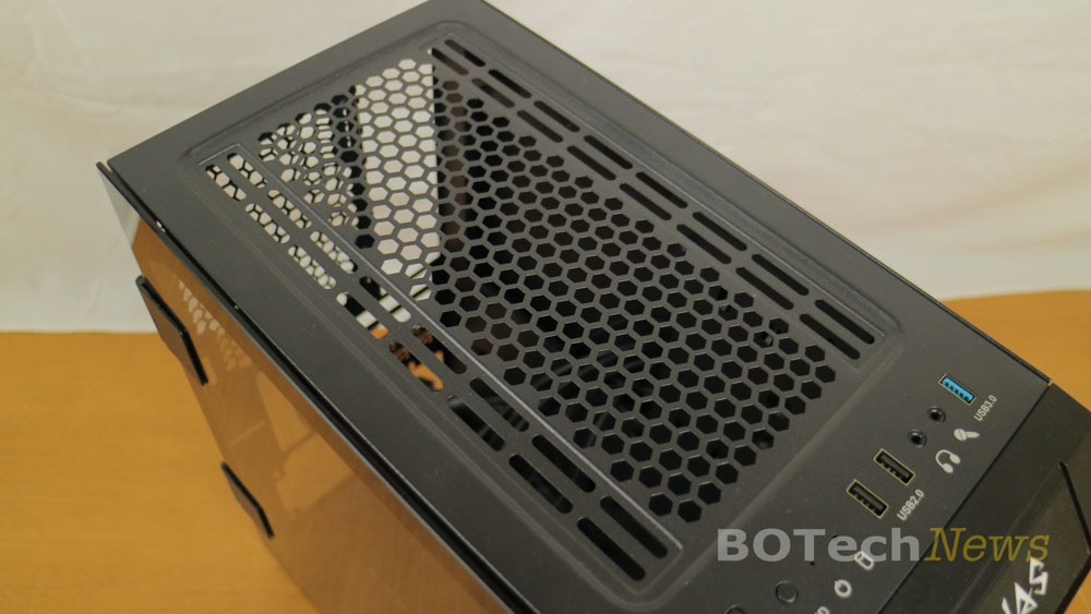Por otra parte, el panel I/O frontal está configurado con un botón de encendido, dos puertos USB 2.0, un USB 3.0, conectores de micrófono y audio, y un controlador LED. Básicamente, en esta ocasión se ha sacrificado un puerto USB 3.0 y la posibilidad de controlar la velocidad de los ventiladores.