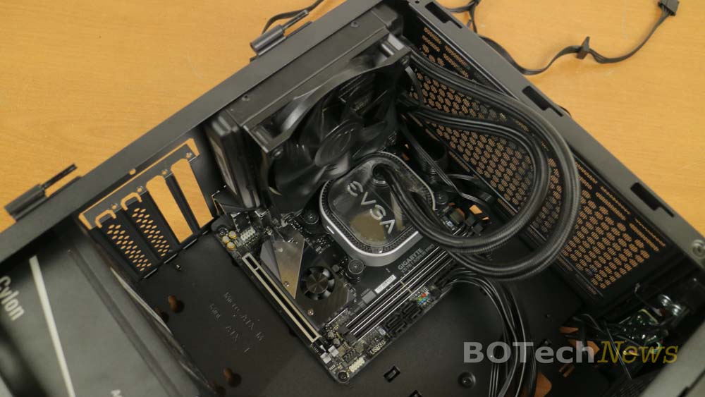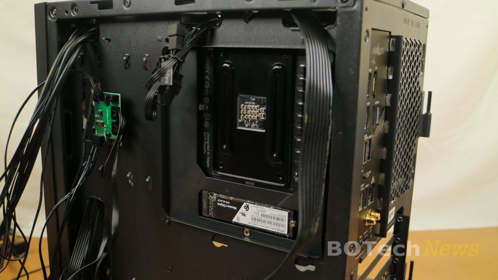 Aquí podemos ver que el esapcio limitado en la bandeja de la motherboard es perfecto para instalar el sistema de enfriamiento líquido sin necesidad de remover la motherboard y que además es suficientemente amplio para colocar un SSD NMVe en la parte trasera de la motherboard.