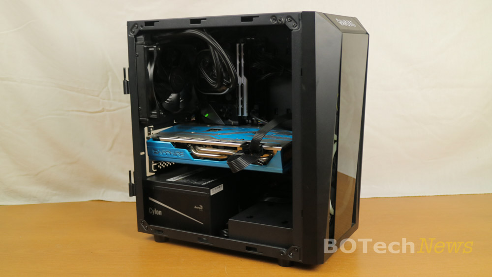 Y así es como luce el gabinete GAMDIAS TALOS E1 RGB Mini Torre completamente ensamblado. Como se pueden dar cuenta, el ensamble es bastante limpio permitiendo que haya un buen flujo de aire interno. También podemos ver que la Radeon RX 590 queda pertecta en este tipo de ensambles.