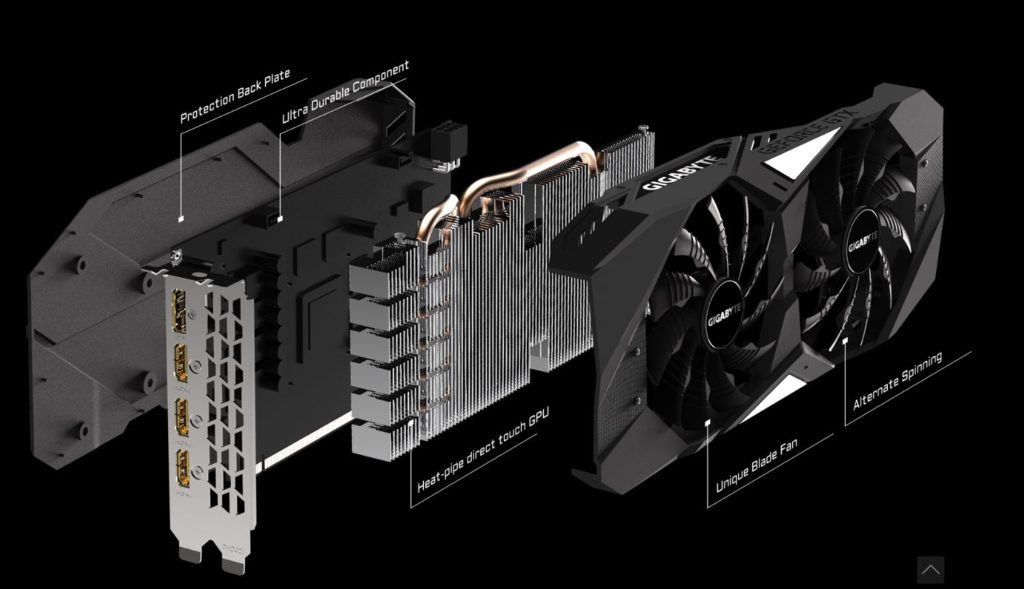 Halando de la tarjeta en cuestión, la GIGABYTE GIGABYTE GTX 1650 OC utiliza el mismo disipador WindForce 2X que conocimos con la GTX 1660 Ti. Esto significa que tiene dos ventiladores de 100mm que giran en dirección opuesta. Éstos a su vez usan Tecnología 3D que apaga los ventiladores cuando la tarjeta no ha entrado en carga.