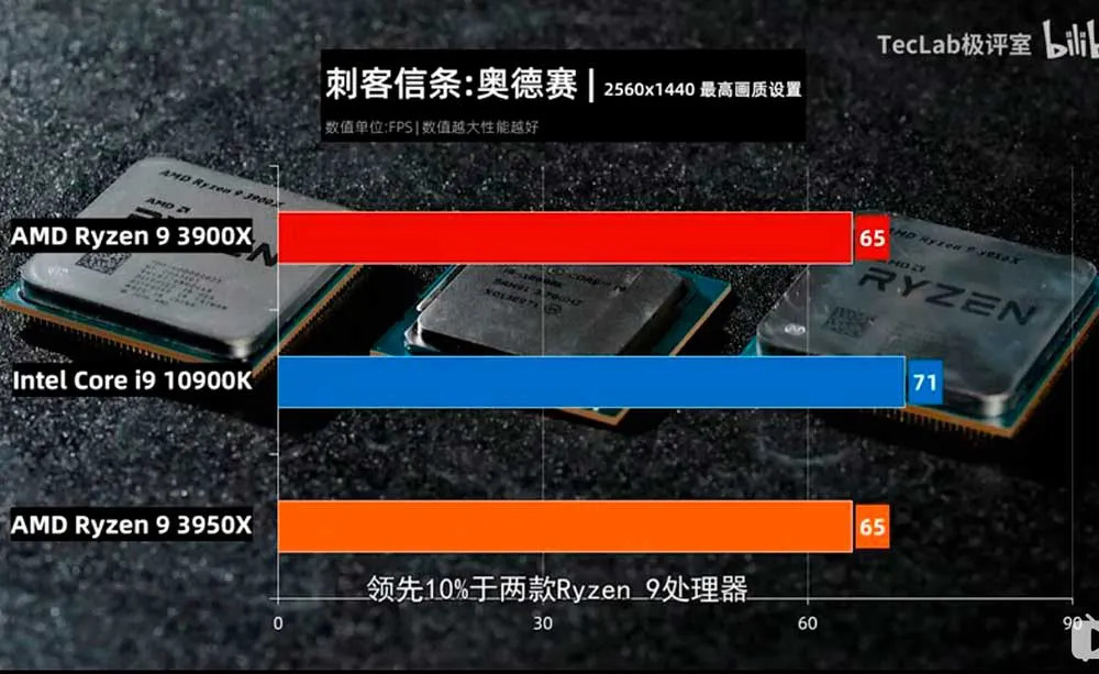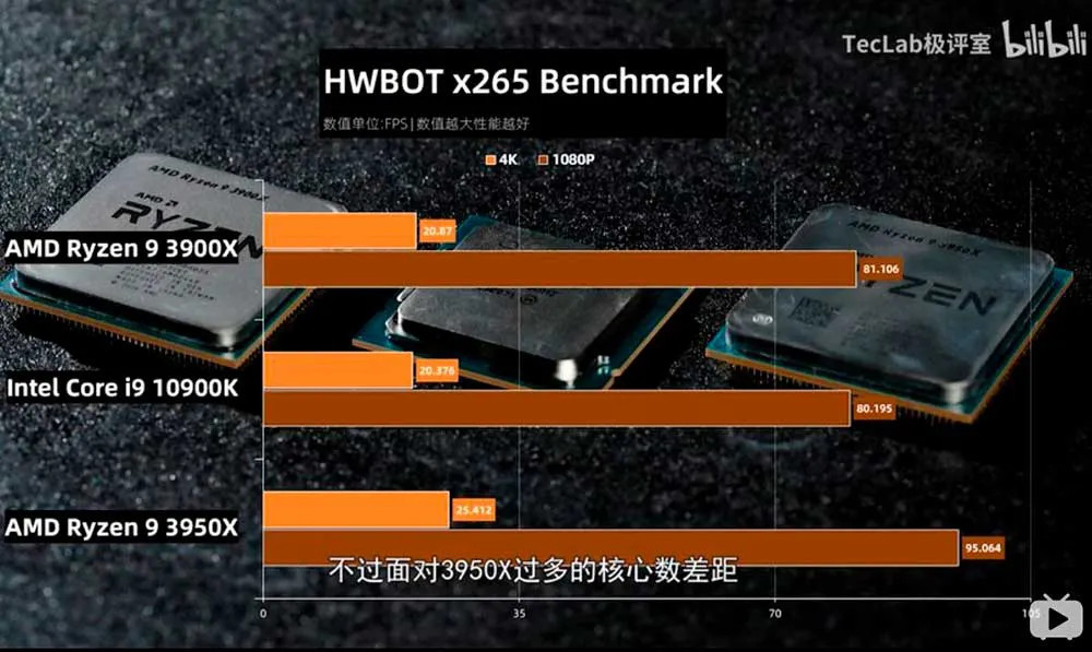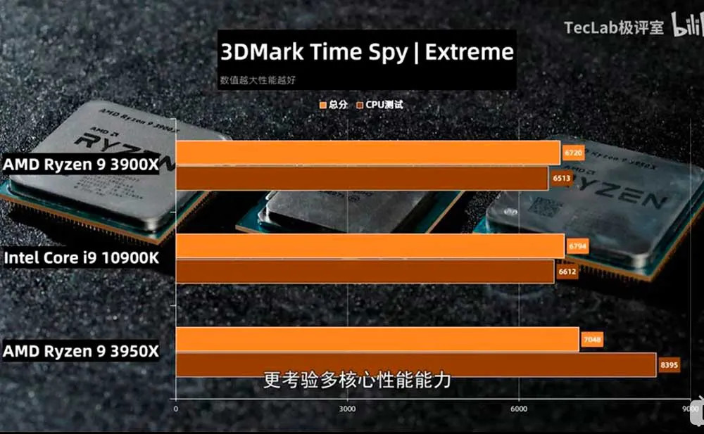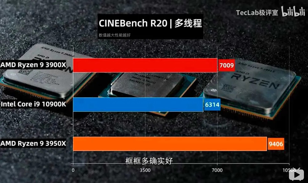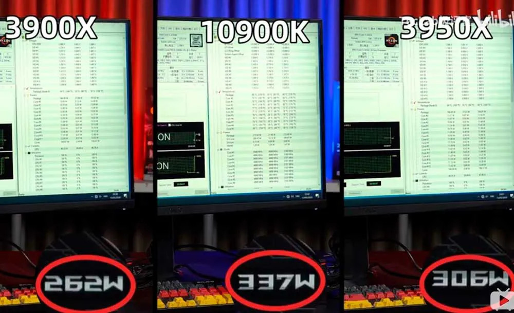 En las comparativas de rendimiento publicadas se muestran resultados entre el Intel Core i9-10900K de 10 núcleos y 20 hilos que trabajan a una frecuencia de hasta 5.3GHz contra el AMD RyZEN 9 3900X de 12 núcleos y 24 hilos y AMD RyZEN 3950X de 16 núcleos y 32 núcleos.