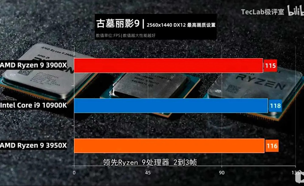 Tomb Raider se probó a resolución 1440p en Calidad Ultra y modo DX12. En este juego se encontró que el Core i9-10900K fue superior a los AMD RyZEN 9 por una diferencia mínima de 7FPS lo cual es imperceptible en un escenario real de gaming.