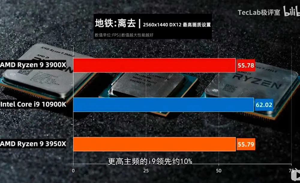 Metro Exodus sigue siendo uno de los juegos más demandantes a la fecha que ponen a sudar a las PC más poderosas. En este caso el Core i9-10900k tanbién obtiene la victoria contra los AMD RyZEN 9 pero únicamente por una diferencia de hasta 3FPS.
