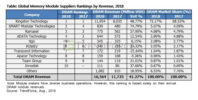 Hablando del posicionamiento del mercado, el reporte menciona que Kingston sigue siendo el rey con el 72.17% del mercado compartido. Le sigue SMART Modular Technologies con el 5.07% del mercado que subió del cuarto lugar en el 2017 a segundo lugar en 2018. Otro fabricante que también tuvo un gran desempeño en el 2018 fue el chino Ramaxel que reportó un incrementó de 40% en ingresos comparado al 2017.