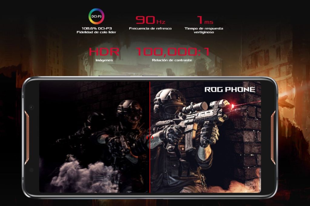 En el caso del ASUS ROG Phone es diferente. Esto se debe a que el smartphone fue diseñado desde cero para cubrir esos pequeños detalles que para un gamer son importantes para tener la mejor experiencia de juego. Tal es el caso de su pantalla AMOLED de 6″ con resolución 2160 x 1080 píxles, 90Hz de refresco, 1ms de tiempo de respuesta, soporte HDR y una relación de aspecto de 18:9. Esto no lo encuentras en cualquier dispositivo.