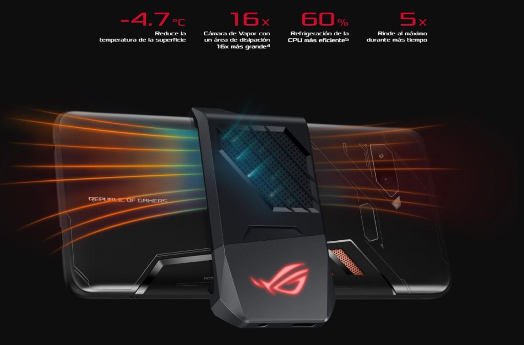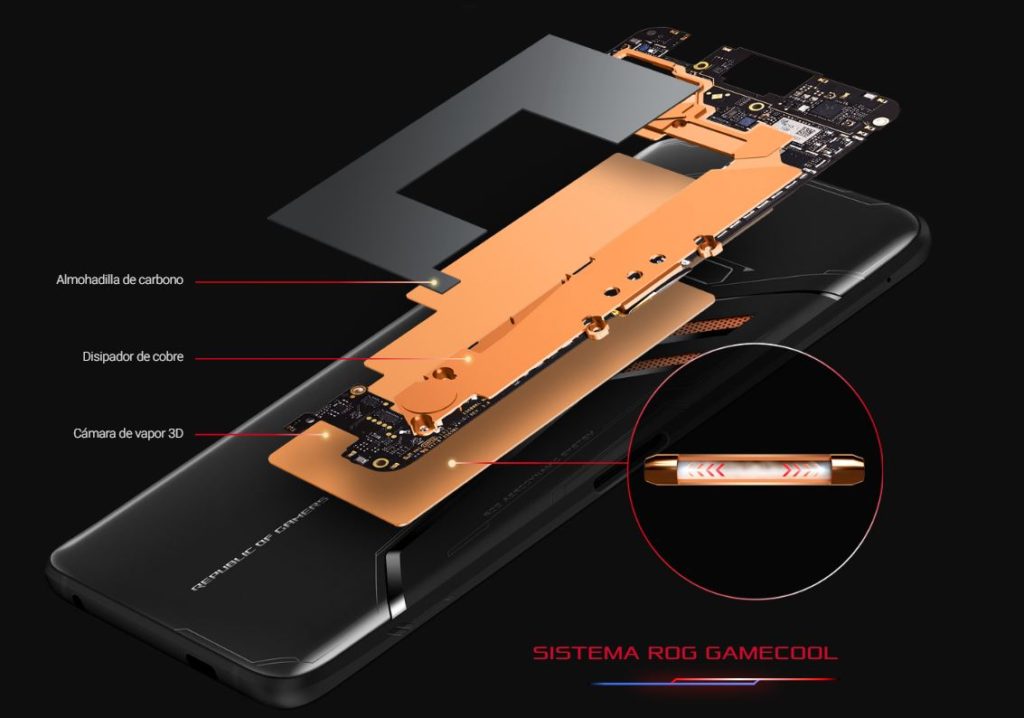 Ya que estamos hablando de un smartphone con grandes capacidades de cómputo, el ASUS ROG Phone también necesita de un buen sistema de enfriamiento. En esta caso se ha implementado una cámara de vapor GameCool que mediante enfriamiento líquido es capaz de reducir hasta 4.7°C la temperatura de la superficie para que el dispositivo esté frió en cualquier escenario.