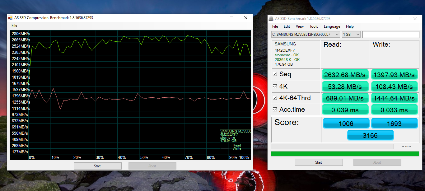 El benchmark AS SSD Benchmark mostró un rendimiento inferior para el Samsung PM981 y que su capacidad de compresión no es tan mala.