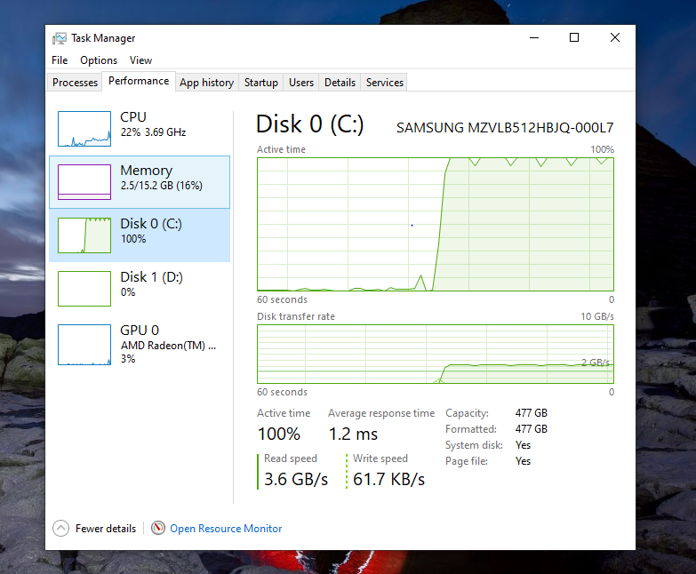 Usando el administrador de tareas de Windows detectamos que la portátil cuenta con un SSD Samsung PM981 NVMe PCIe Gen 3 de 512GB.