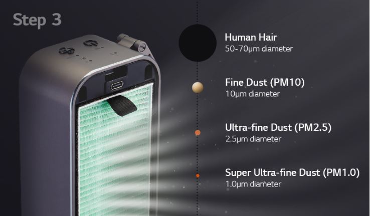 El secreto de este pequeño purificador radica en que utiliza un sistema de filtración de aire en 4 pasos: El primero consiste de un sensor PM1.0 que detecta de forma precisa la calidad del aire; una vez hecho un compresor Dual Inverter aspira el aire a 5,000 rpm; después actúa un filtro de alta eficiencia Total Allergen Removal que elimina partículas de aire; y finalmente, un ventilador Doble Twin Tornado regreas aire limpio en todas direcciones.