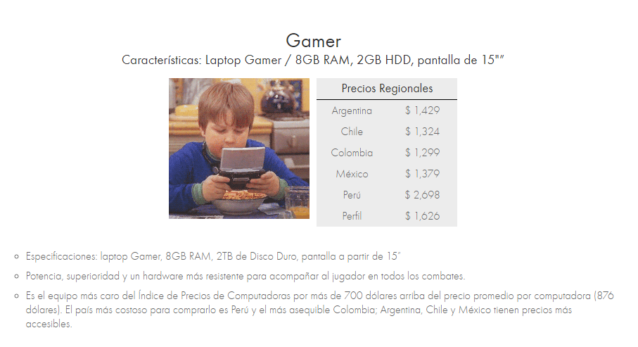 En un interesante análisis Índice de Precios de Computadoras 2019, donde se compara precios de regiones como Argentina, Colombia, México y Perú, Linio identificó 5 perfiles de consumidores de acuerdo a sus requisitos de computo. hogar, trabajo, escuela, gamer y emprendedor, que nos permiten entender qué tanto se gasta de acuerdo a las necesidades de cada uno.