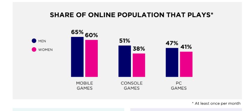 Por parte del estudio de Newzoo señalan que el dispositivo móvil sigue siendo la plataforma favorita para los gamers, de los cuales el 65% son hombres y el 60% son mujeres. Este panorama se repite entre los gamers de PC donde el 47% son hombres y el 41% son mujeres.