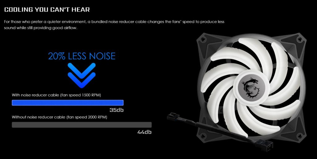 Para reducir aún más los niveles de ruido, MSI ha incluido un cable que ayuda a reducir hasta 20% los niveles de ruido de los ventiladores. Básicamente lo que hace este cable es ajustar la velocidad de los ventiladores de 2000RPM a 1500RPM sin sacrificar flujo de aire.