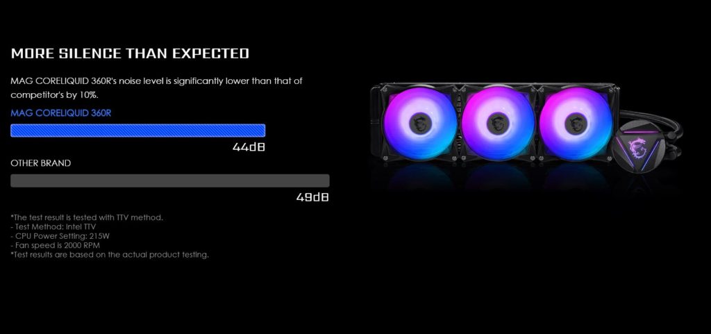 MSI también ha compartido algunas cifras de rendimiento aunque no de temperatura sino en cuanto a nivel de ruido. En este caso recalcan que el modelo de 360mm es hasta 10% más silencioso que la competencia. Aquí es interesante ver que MSI quiere vender sus watercooling AIO como lo más silenciosos y no como los más eficientes en disipación de calor. Quizás nos estamos equivocando.