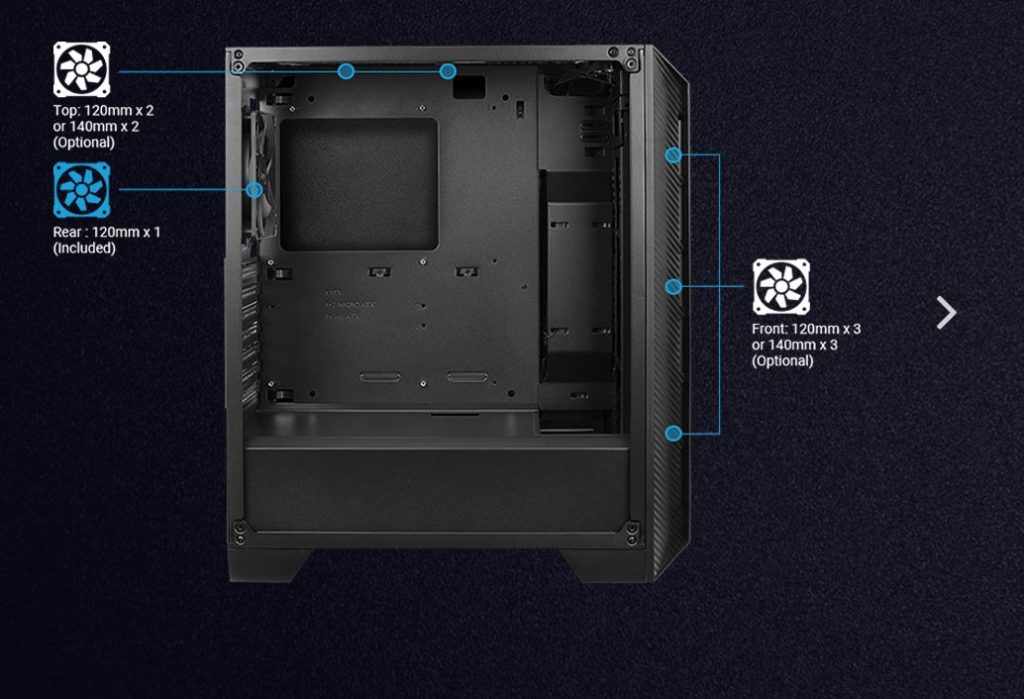 | Enfriamiento Aire | 1 – Frontal: 120mm x 3 or 140mm x 3 (Optional) 1 – Superio: 120mm x 2 or 140mm x 2 (Optional) 1 – Trasero: 120mm x 1 (Includes 120mm Black Fan x 1) |