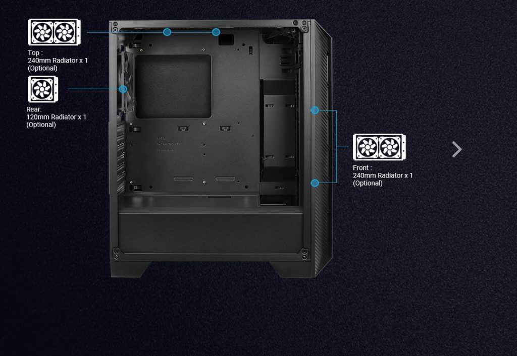 | Enfriamiento Líquido: | 1 – Frontal: 240mm Radiator (Opcional) 1 – Superior: 240mm Radiator (Opcional) 1 – Trasero: 120mm Radiator (Opcional) |