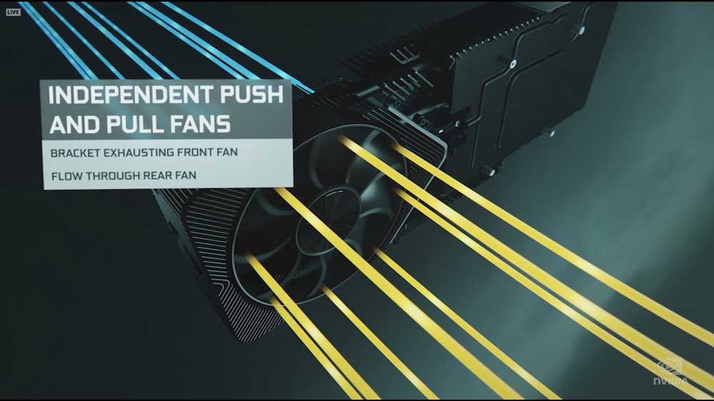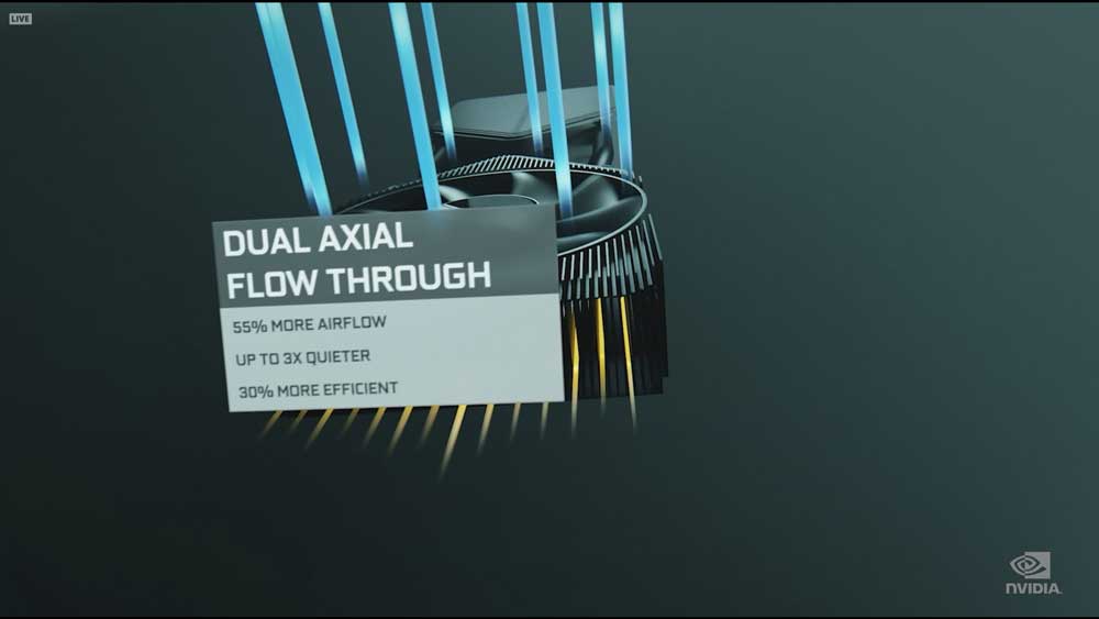 De acuerdo a NVIDIA este diseño Axial de doble cara es capaz de ofrecer hasta 2x veces mayor capacidad de enfriamiento, entrega hasta 55% mayor flujo de aire, es 3x más silencioso y hasta 30% más eficiente.