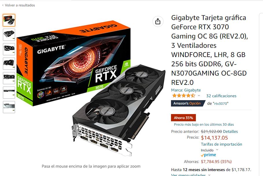 La tarjeta de video GIGABYTE GeForce RTX 3070 Gaming OC 8G es vendida por Amazon México a un precio de $14,137 MXN lo que significa que tiene 35% de descuento de su precio original de hasta $25,000 MXN a principios del mes de marzo de 2022.